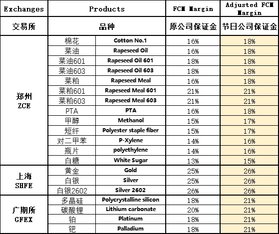 2026年元旦节假期临近,为防范外盘波动及基本面变化给期货交易带来的风险,郑州商品交易所、上海期货交易所和广州期货交易所将提高和扩大部分品种的保证金水平和涨跌停幅度。因此公司决定自12月30日结算时将调整部分品种标准保证金,具体调整比例见下表: